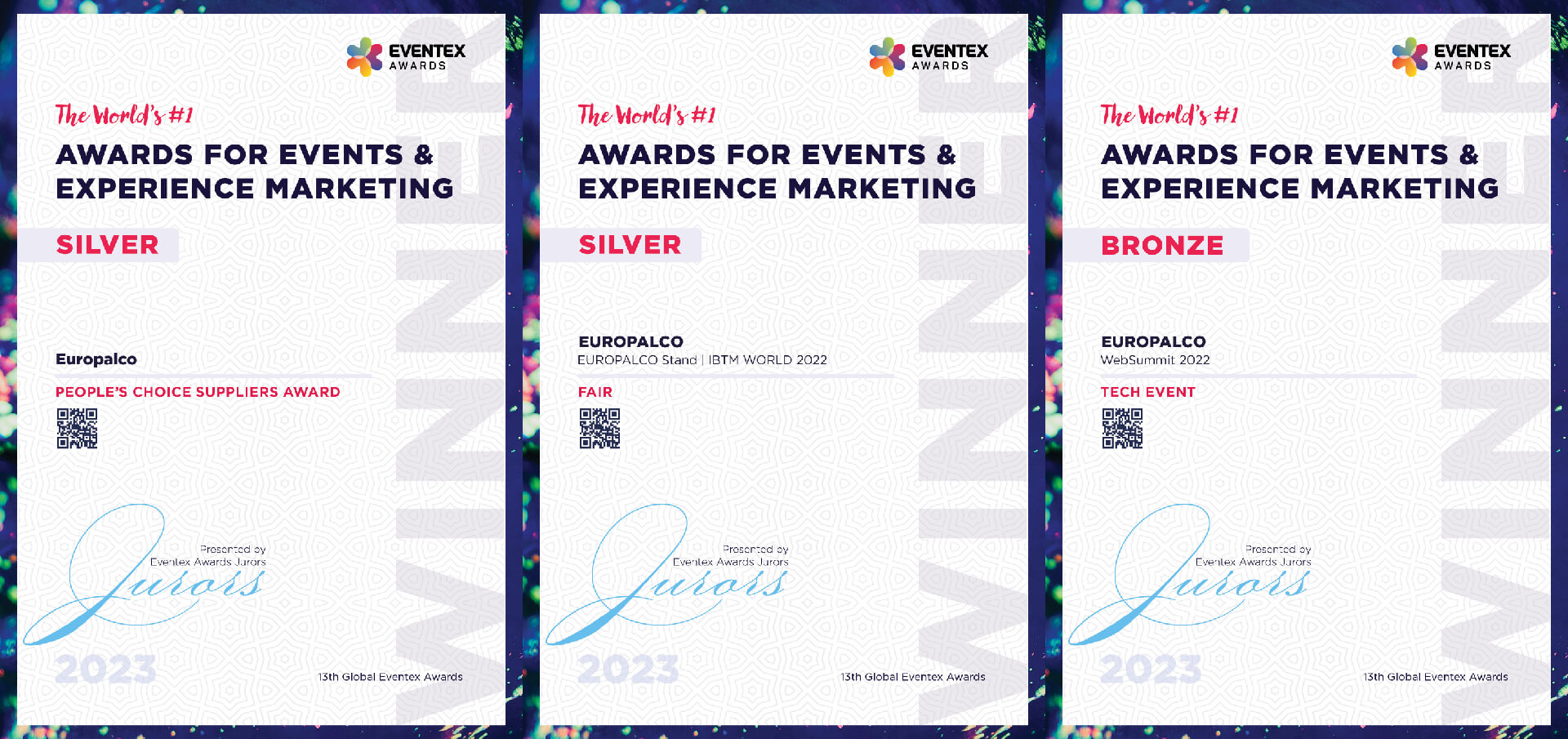It is with great satisfaction that we announce the achievement of two silvers in the Fair category, with the Europalco IBTM World 2022 Stand, and in the People's Choice Suppliers category, as well as one bronze in the Tech Event category, with the Web Summit 2022.